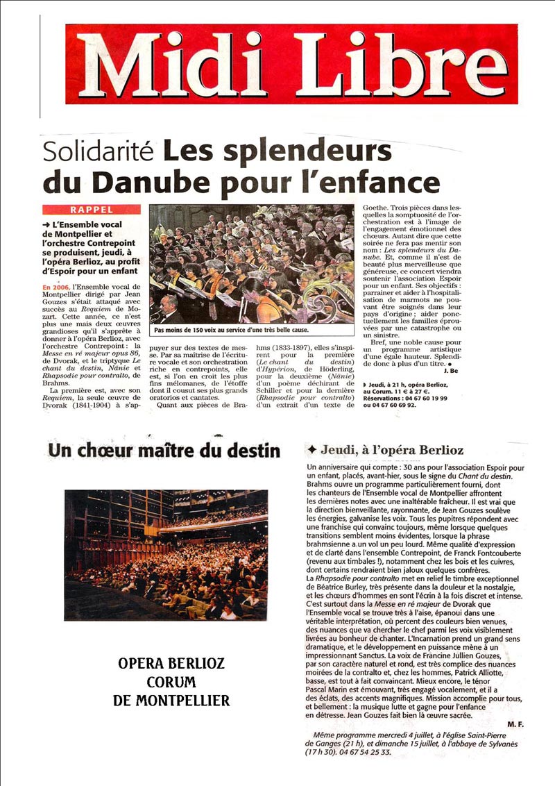 « L’aisance, la qualité des voix, sous une direction pleine de chaleur et de précision, à la fois contemplative et lyrique, font de l’Ensemble Vocal de Montpellier, une exellente formation. La richesse de son répertoire est la preuve d’un travail exemplaire »